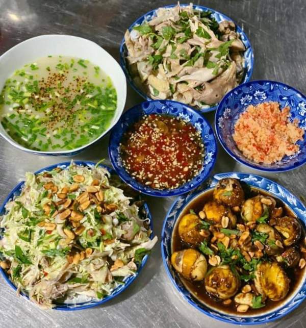 Cháo gà, gỏi gà, trứng vịt lộn xào me