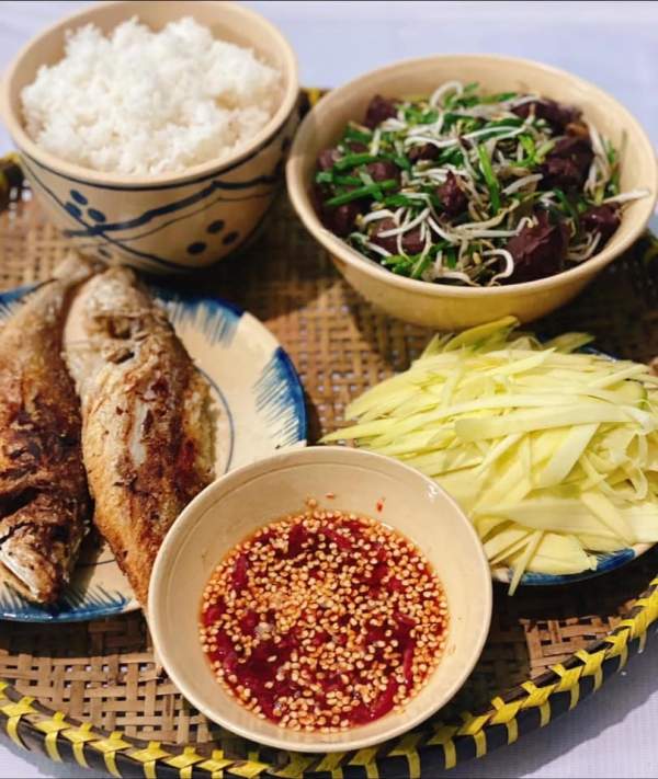 Cá khô một nắng chiên, xoài dầm mắm cay, huyết heo xào giá hẹ