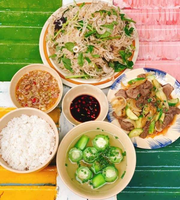 Rau chuối, bò xào củ hành dưa leo, canh mướp