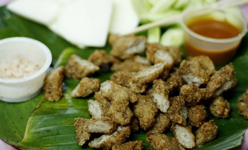 Được mệnh danh là thiên đường nem chua rán ở Hà Nội, ngõ Tạm Thương nằm khuất trên phố Hàng Bông sầm uất, chỉ dài khoảng 10 m nhưng có đến 6, 7 hàng cùng bán món này. Nem được rán vừa phải, không ngấy, ăn giòn với giá 30.000-40.000 đồng một đĩa. Ngoài ra bạn có thể ăn kèm củ đậu, dưa chuột, xoài xanh, khoai tây chiên... Ảnh: Út Liên.