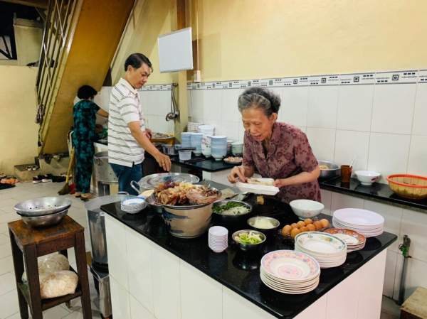 Cô Út thợ nấu chính nay đã 72 tuổi, và anh Lam thợ phụ đã 60 tuổi, là thế hệ thứ hai của quán phở Minh. Ảnh: N.H