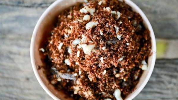 Món ăn này thật ra là tên gọi của đu đủ xanh thái sợi, trộn cùng với kiến vàng còn sống, giã nhuyển. Khi ăn, cho thêm một ít ớt tươi và lá é để tăng thêm hương vị. Lần đầu ăn có thể cảm nhận rất rõ cái vị chan chát của đu đủ hòa với vị chua thanh của kiến vàng, vị cay xè của ớt và vị thơm bùi của lá é.