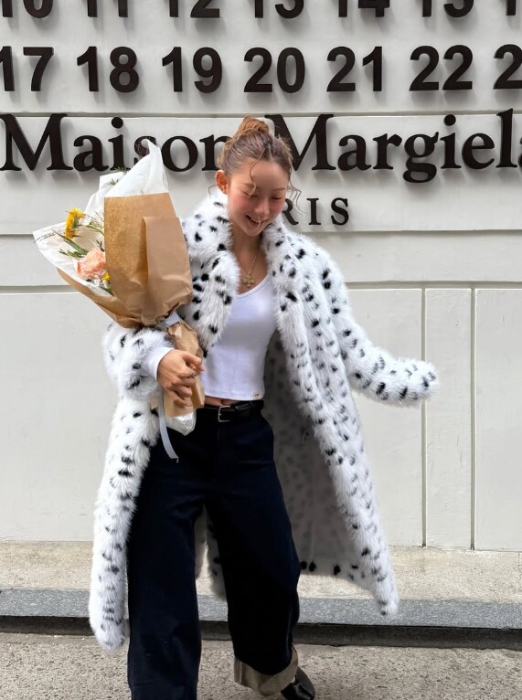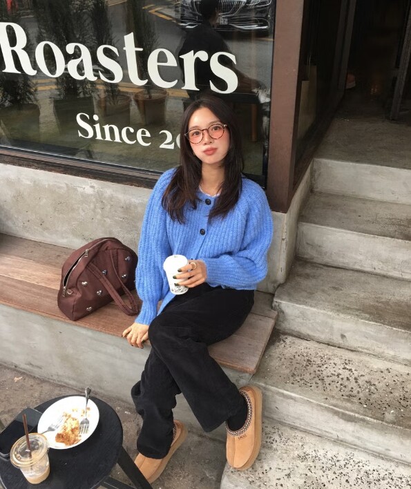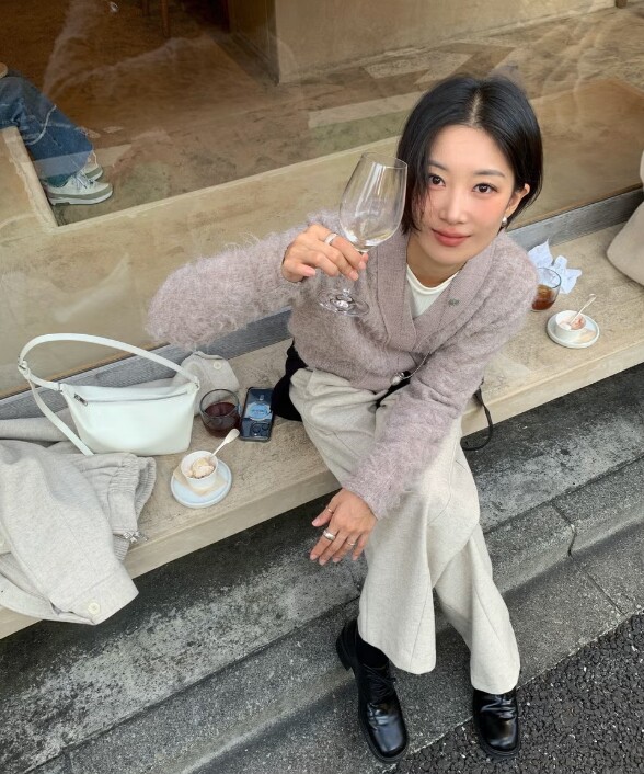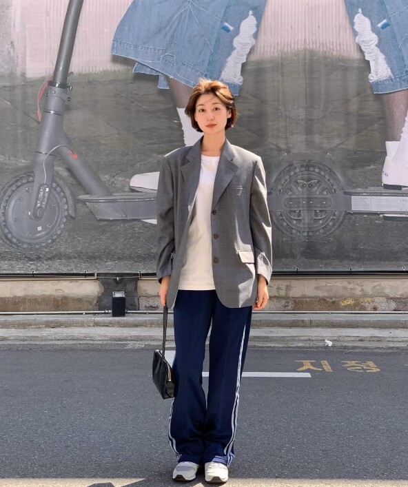 Biểu tượng thời trang Hàn Quốc Mookwa rất giỏi thể hiện phong cách Hàn Quốc đơn giản. Trong bộ trang phục này, cô mặc áo phông trắng với áo khoác blazer màu xám, phần thân dưới mặc quần thể thao sọc xanh trắng và giày thể thao trắng. Set đồ này tạo nên phong cách kết hợp giản dị và năng động.