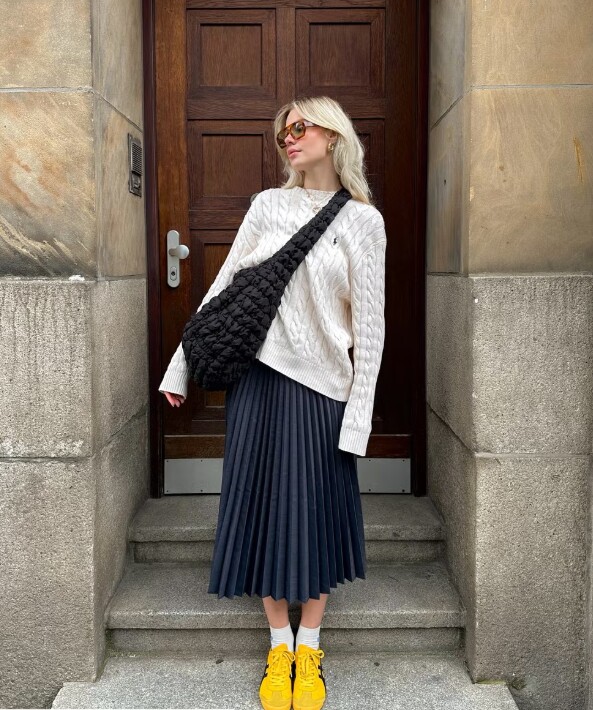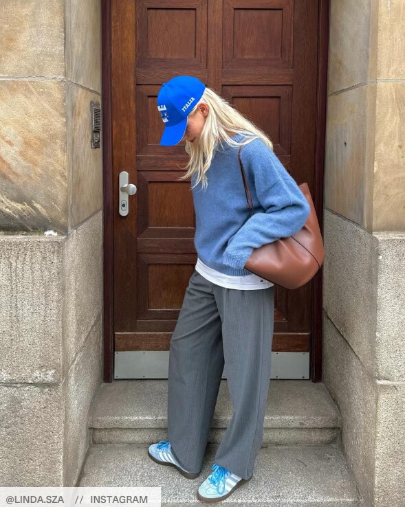 Set đồ của fashionista người châu Âu có màu chủ đạo chính là xanh da trời. Diện áo len xanh da trời với quần âu màu xám, cô nàng sành điệu đã tinh tế phối thêm áo phông trắng bên trong tạo cảm giác xếp lớp. Cuối cùng, cô sử dụng mũ màu xanh đậm và giày thể thao màu xanh nhạt sáng để tạo hiệu ứng chuyển màu đẹp mắt. Với bộ đồ đơn giản này nhưng cô đã có thể tỏa sáng giữa mùa đông.