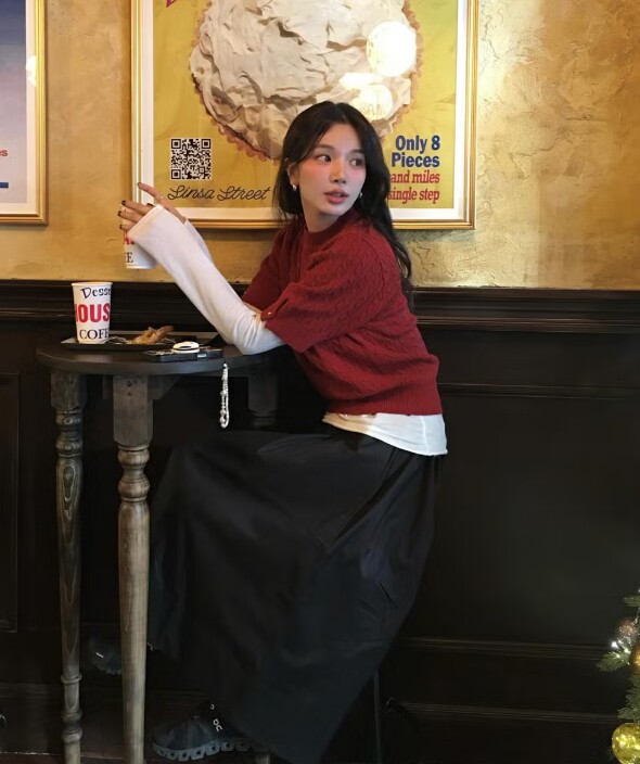 Một set đồ phối 3 màu đỏ, trắng, đen khác trông cơ bản và dễ phối hơn đó là mặc áo len màu đỏ sẫm và lớp lót màu trắng bên trong làm nổi bật phần eo cao và tỷ lệ cơ thể cân đối.