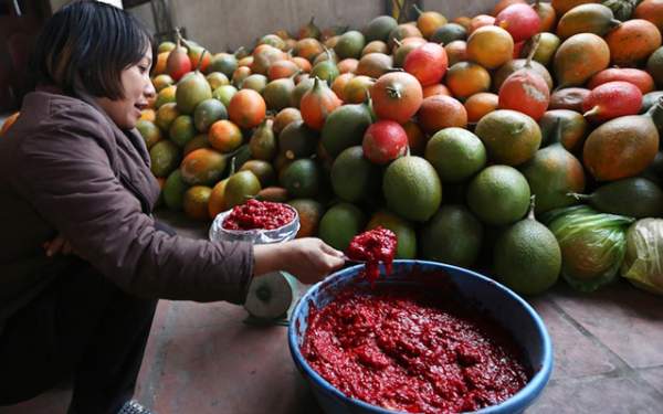 Đang mùa gấc rộ, giá cà chua đắt đỏ nên mọi nhà tranh thủ mua gấc về làm xốt trữ ăn dần mùa đông. Ảnh minh họa.
