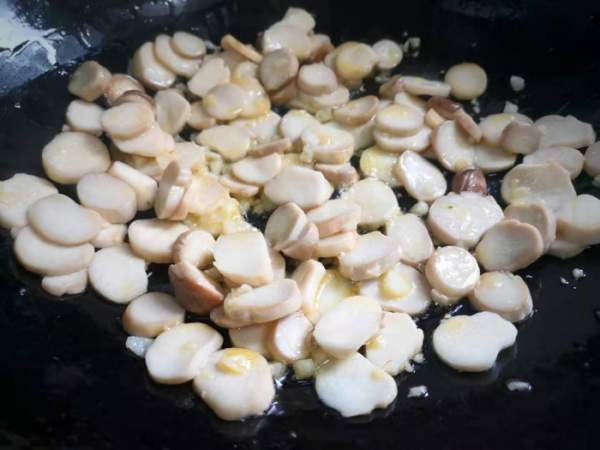 Tỏi băm nhỏ. Cho ít dầu ăn vào chảo đun nóng, cho tỏi băm vào phi thơm, sau đó cho nấm đùi gà đã chần qua vào, xào cho ra bớt nước, đến khi bề mặt nấm hơi vàng.
