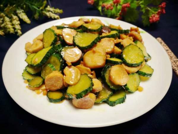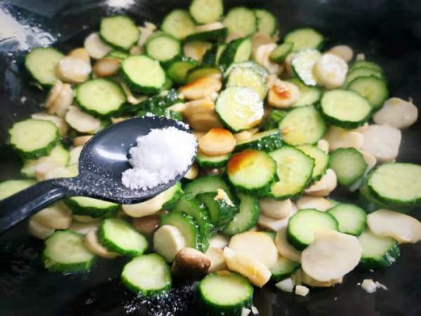 Cho các lát dưa chuột vào, xào nhanh tay, thấy các miếng dưa chuột cũng hơi mềm thì cho chút muối, nước tương, dầu hào, nêm nếm theo khẩu vị cá nhân.