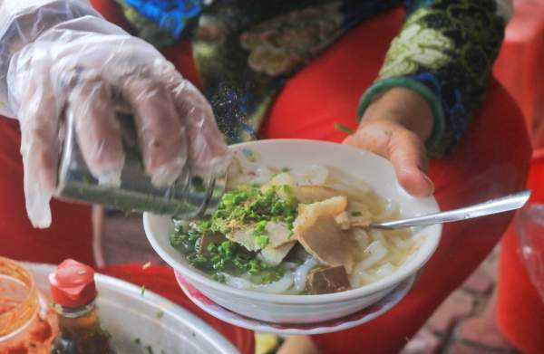 Một thoáng, cũng tới lượt tô bánh canh của tôi. Cô Lệ cầm chiếc đũa dài múc bánh từ nồi nước lèo trong vắt ra, sẵn lấy thêm mấy miếng huyết heo rồi chan nước dùng vừa ngập hết bánh. Liền tay, bà chủ lấy mấy miếng thịt heo được thái sẵn bỏ lên, rồi cho một chút hành, tiêu, ớt. Vậy là xong, tôi cầm trên tay tô bánh canh nóng hôi hổi, mùi thơm nghi ngút.