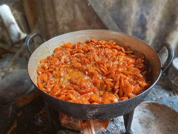 Những con tôm được làm sạch, kho rim với đường và nước mắm trên bếp lửa liu riu.