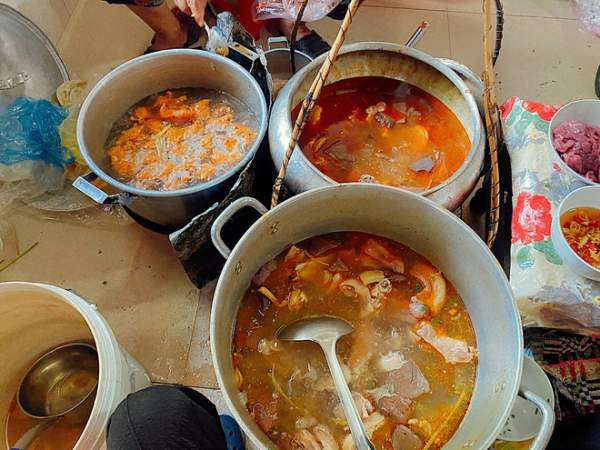 Gánh bún nhỏ được đặt dưới nền nhà sạch sẽ, 2 nồi nước lèo bốc khói nghi ngút, tỏa ra một mùi thơm đặc trưng của nước lèo đậm đà vị ruốc sả nhưng lại rất trong và cay nhẹ đầu lưỡi. Phần nước lèo được nấu chung với tất cả gân huyết, chả, giò heo…
