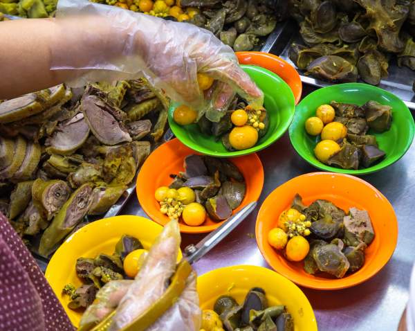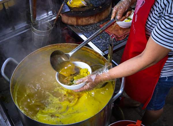 Tùy theo sở thích, thực khách có thể lựa chọn cà ri gà hoặc cà ri vịt để thưởng thức. Sau khi chặt nhỏ, thịt được đem chần với nước sôi sau đó thêm các nguyên liệu khác như mề, gan, khoai lang... Cuối cùng, nước dùng và tiết sẽ được thêm vào để sẵn sàng phục vụ thực khách.