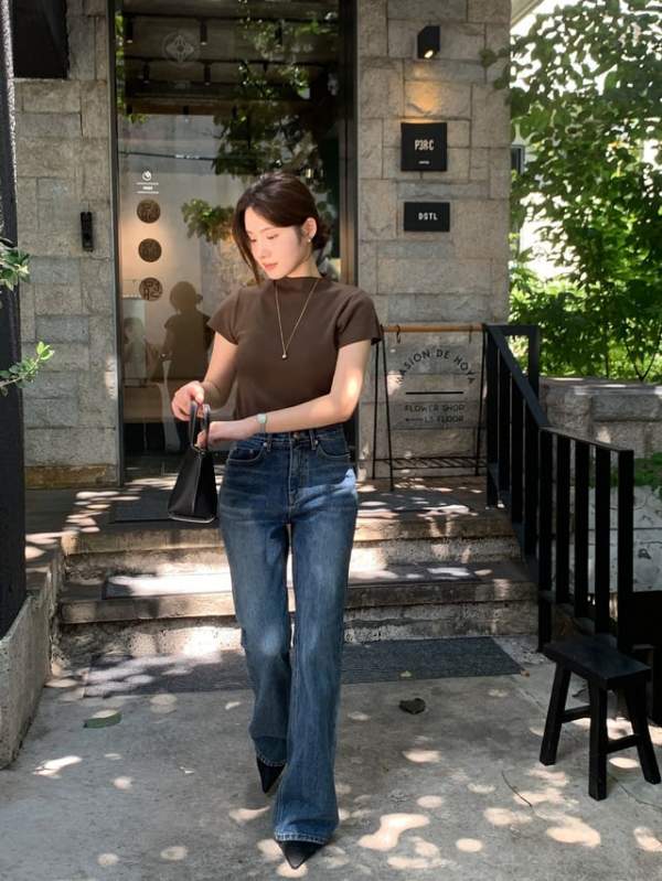Áo thun cổ 3 phân màu nâu phối cùng jeans ống loe sẽ mang đến sự cân bằng