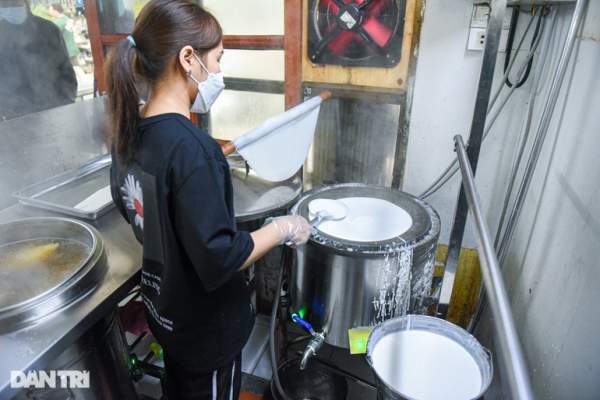Một chiếc nồi hơi và thùng bột, những chiếc bánh phở được một nhân viên phụ trách tráng và sử dụng tươi tại chỗ.