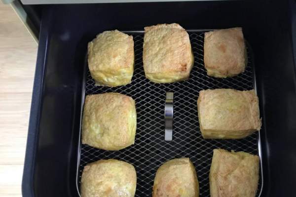 Cách rán đậu phụ bằng nồi chiên không dầu: Đặt đậu trong nồi chiên, nhớ để các khoảng trống