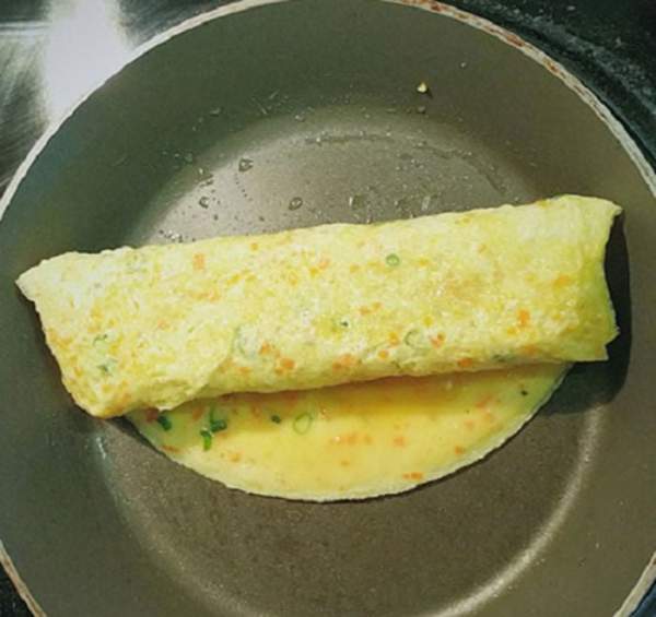 Bước 2: Cho dầu ăn vào chảo, đợi dầu thật nóng thì đổ trứng vào và dàn mỏng. Lật lại để trứng được chín đều. Dùng đũa cuộn tròn trứng lại.