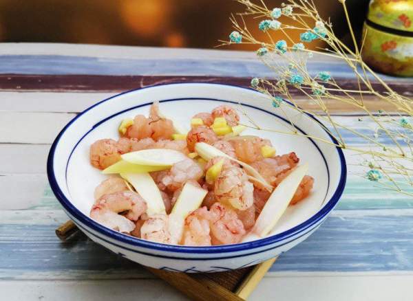 Tiếp theo, sơ chế tôm. Tôm bóc vỏ, bỏ chỉ đen, rửa sạch, để trong bát. Thêm 0,5g muối, 5g hành lá xắt nhỏ, 3g gừng băm nhỏ, khoảng 0,3 g bột hạt tiêu và 5g rượu nấu ăn, trộn đều. Ướp trong 30 phút, tôm vừa ngon và bớt tanh.