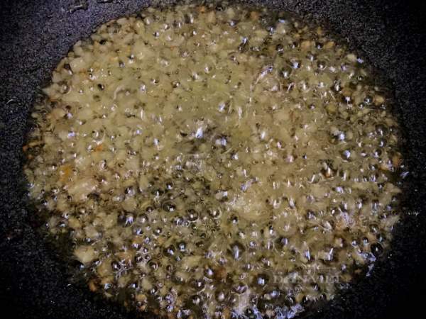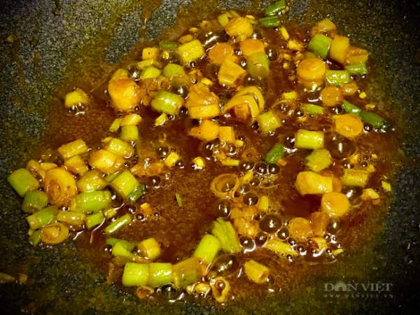 - Tiếp tục cho dầu vào chảo. Cho 1/2 số hành xắt hạt lựu vào phi. Hành vừa vàng thì tắt lửa và cho 1 muỗng bột nghệ vào, xào không lửa cho đến khi bột nghệ tan hoàn toàn trong dầu.