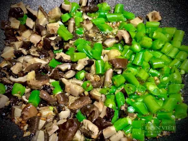 - Bắc chảo dầu nóng. Cho tỏi vào phi vàng. Sau đó, cho đậu que và nấm đông cô đã xắt hạt lựu vào xào. Cho toàn bộ sốt dầu hào vào chảo, đảo đều cho các nguyên liệu thấm sốt rồi trút ra dĩa.