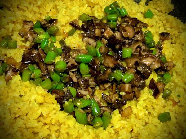 - Cho toàn bộ nấm đông cô và đậu que đã xào với sốt dầu hào và cơm. Trộn thật đều. Chiên cơm thêm khoảng 2 phút để sốt thấm vào cơm.