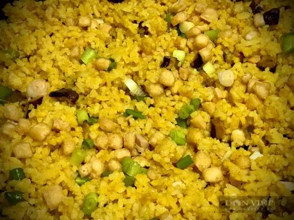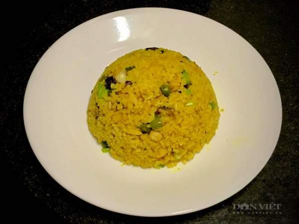 Hạt cơm vàng đều, không bị dính nhau. Thơm mùi nghệ, mùi nấm. Đậu vẫn xanh, giòn, ngọt. Tất cả hoà quyện vào nhau một cách hoàn hảo.
