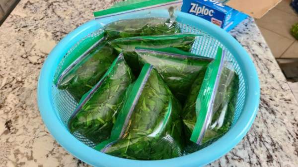 "Ở Việt Nam mình rau ăn tươi mỗi ngày, còn sống bên Mỹ, nửa năm lạnh nửa năm nóng, rau trồng được phải đông đá để giành mùa đông ăn. Vì rau bên này mua mắc lắm, với chợ Việt Nam cũng xa nhà.", chị Teresa Hà chia sẻ lý do trữ đông rau.