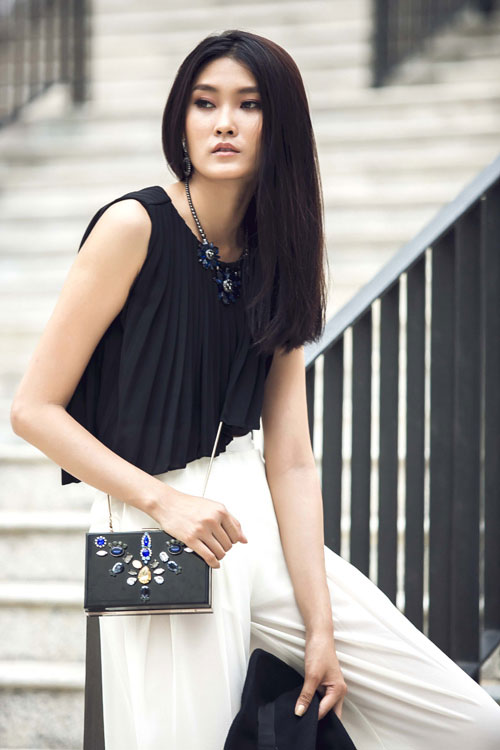 Áo lửng xếp nếp bay bổng và rất nữ tính kết hợp cùng chiếc quần chất liệu mềm mại.