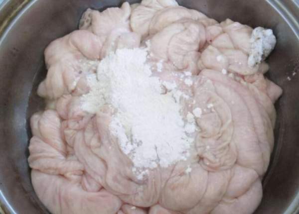 Đối với ruột lợn sau khi làm sạch đơn giản, bạn cho hai nắm lớn bột mì vào, trộn đều với bột năng và ruột già lợn ngấm đều gia vị. Bột có khả năng hấp phụ rất mạnh, trong quá trình nhào nắm và trộn có thể hút hết chất nhầy và tạp chất trên bề mặt ruột già, chất nhầy trên bề mặt ruột già là nơi tanh nhất.