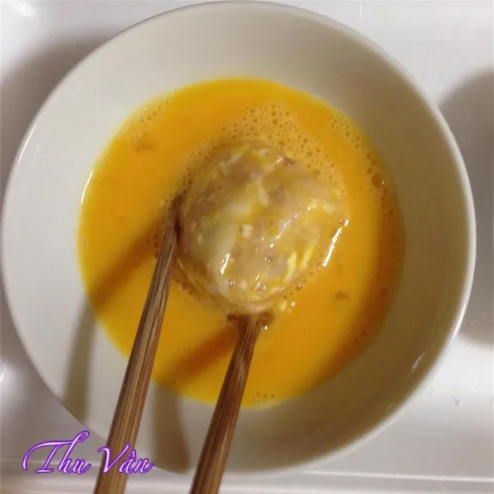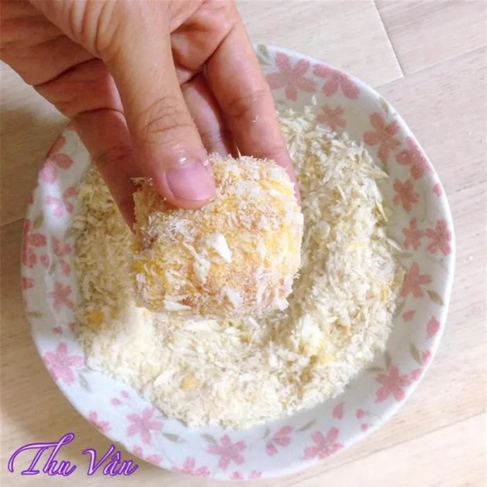 Bước 3: Thịt đã cuốn xong, lăn qua bột mì khô, rồi nhúng vào trứng đã đánh tan, sau đó lăn qua bột chiên xù.