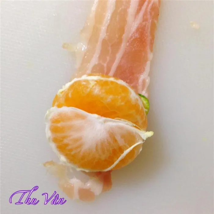 Bước 2: Cho 1-2 lát thịt lên thớt, rắc thêm 1 chút muối tiêu. Cho khoảng 2-3 múi quýt cùng vỏ quýt lên trên thịt, gói lại cho kín múi quýt.