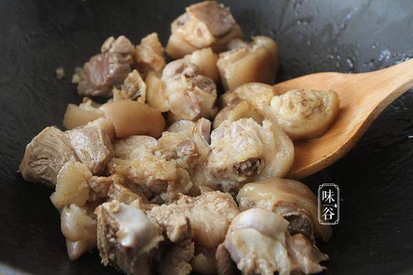 Đun nóng dầu trong chảo, cho đường phèn vào, vặn lửa vừa, khuấy đều để nó chuyển sang màu caramel. Đổ chân giò vào, đảo đều.