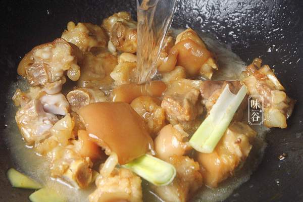 Thêm lát gừng, hành lá, lá nguyệt quế, nước tương, quế và các loại gia vị khác. Sau đó cho nước nóng vào, lượng nước không quá nhiều.