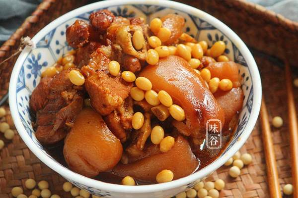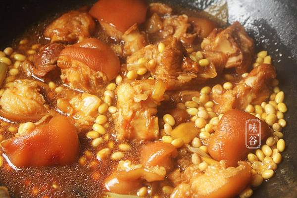 Cho đậu nành vào, đun nhỏ lửa trong 60 phút cho chân giò chín nhừ, nêm nếm lại gia vị cho vừa miệng là xong.