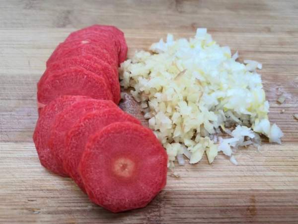 Gọt nửa củ cà rốt và cắt thành lát dày. Hành lá xắt nhỏ, gừng băm nhỏ, một ít cà rốt đem băm nhỏ.