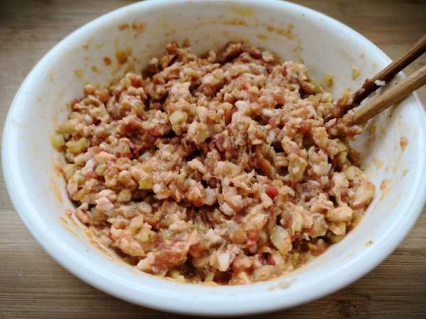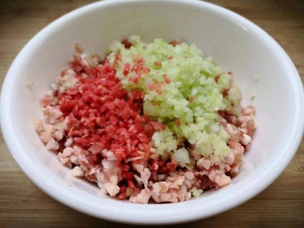 Thêm hành lá, gừng, cà rốt thái nhỏ và cần tây thái nhỏ vào bát thịt băm để nhân bớt ngấy.