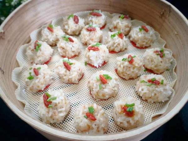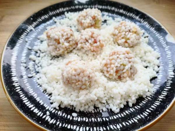 Lấy thìa múc nhân, dùng tay vo thành viên tròn rồi lăn viên thịt vào bát gạo nếp vài lần sau cho thịt được phủ đều gạo nếp. Sau đó dùng tay vo nhẹ để gạo nếp không bị rơi xuống.