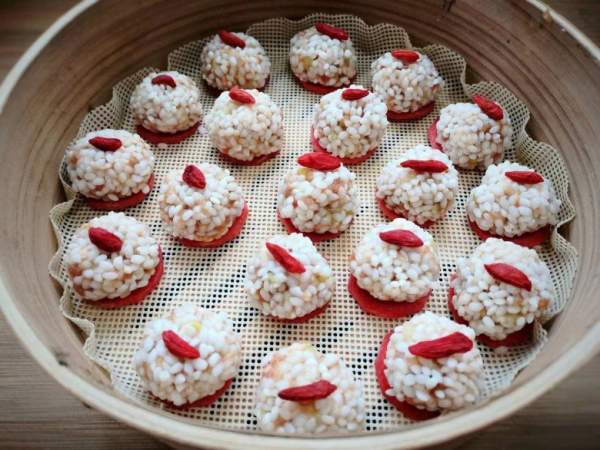 Cho các lát cà rốt vào xửng hấp, xếp từng viên gạo nếp lên trên, trên mỗi viên đặt một 1 quả kỷ tử, (ngâm kỷ tử trước cho mềm).