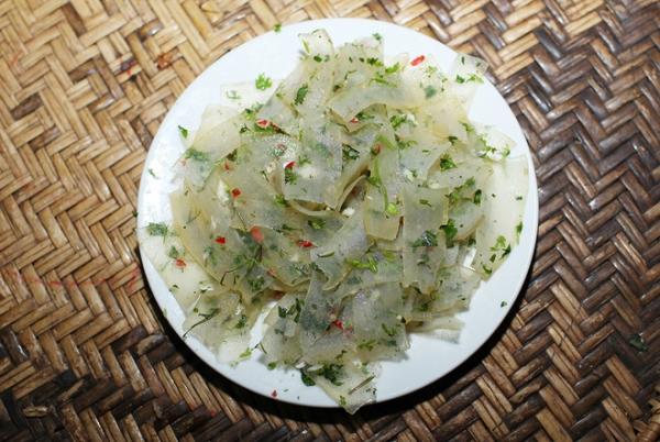 Món nộm này chỉ được làm khi gia đình có hiếu hỷ, hoặc nhà có khách quý, bởi sơ chế rất mất thời gian. Da trâu làm sạch, thái mỏng, đập giập ướp nhiều gia vị. Khi ăn sẽ có cảm giác dòn, dai, rau thơm và hạt tiêu rừng khiến những vị khách khó tính không để đôi đũa nghỉ.