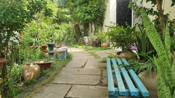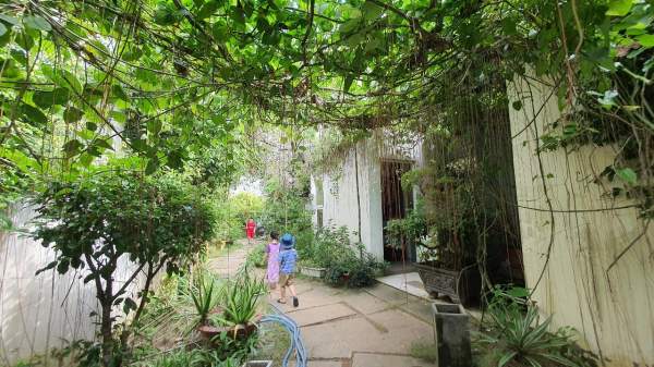Những ngôi nhà nhỏ nằm kế bên nhau, lối đi tràn ngập cây và hoa, cả một khu vườn rộng lớn phía sau trồng dừa, mai và ao hoa sen tới mùa nở thơm ngát. Khu vui chơi cho trẻ em được tái chế từ gỗ, lốp xe, bàn ăn và những chiếc bàn xinh xắn cho ai thích làm việc giữa thiên nhiên cũng được đóng từ gỗ mộc mạc.