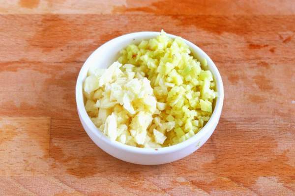 Hành lá rửa sạch thái nhỏ, chia phần trắng và xanh để riêng. Gừng gọt vỏ, rửa sạch, băm nhỏ.