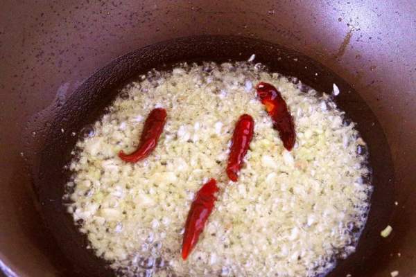 Đun nóng dầu trong nồi, cho phần đầu trắng hành lá, gừng và ớt khô vào xào cho thơm.