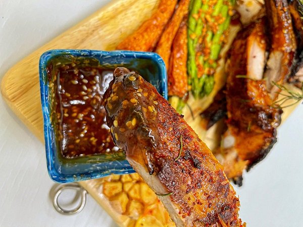 - Bạn xếp sườn lên dĩa cùng với cà rốt, măng tây, tỏi nướng, thêm chén nước sốt ướp thịt để chấm sườn.