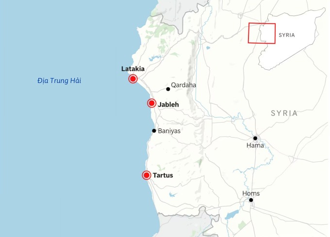 Vị trí Jableh, Baniyas, Qardaha, Latakia và Tartus ở vùng ven biển Syria. Đồ họa: AP