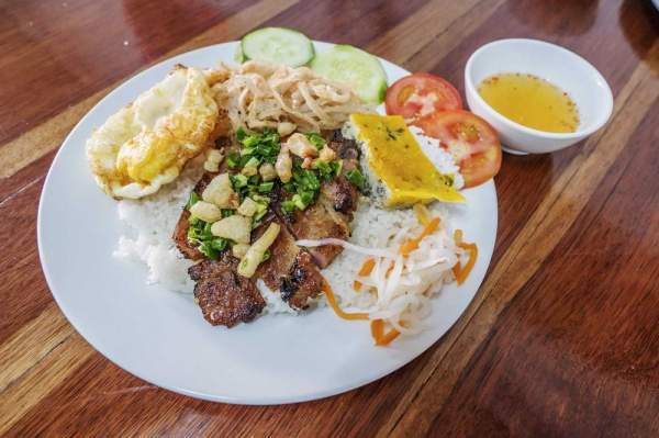 Đi trên đường phố Sài Gòn, thực khách sẽ thấy các hàng quán bán cơm tấm ở mọi nơi vì đây là món ăn đường phố có tiếng nhất và cũng dễ ăn nhất. Cơm tấm là một phần cơm (nấu từ gạo vỡ) ăn cùng thịt, sườn heo, trứng chiên, chả trứng hoặc cá, với rau dưa, nước chấm chua ngọt. Không chỉ người Việt ưa chuộng mà cả khách nước ngoài cũng mê mẩn món ăn này.
