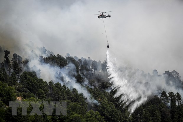 Trực thăng cứu hỏa phun nước dập đám cháy rừng tại Manteigas, Bồ Đào Nha ngày 10/8/2022. (Ảnh: AFP/TTXVN)Ngày 14/8, khoảng 300 lính cứu hỏa cùng trực thăng đã được huy động để khống chế vụ cháy rừng dữ dội ở vùng Aragon, miền Bắc Tây Ban Nha.