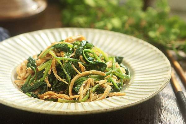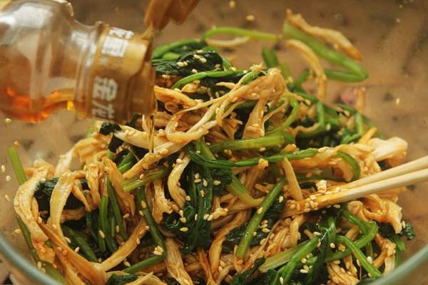 Lấy một tô lớn hơn, cho rau cải bó xôi và thịt gà xé nhỏ vào, thêm hành lá và mè vừng đã rang chín, trộn đều. Thêm nước tương, giấm, muối, tiêu, đường, trộn đều rồi rưới dầu mè lên và thưởng thức.