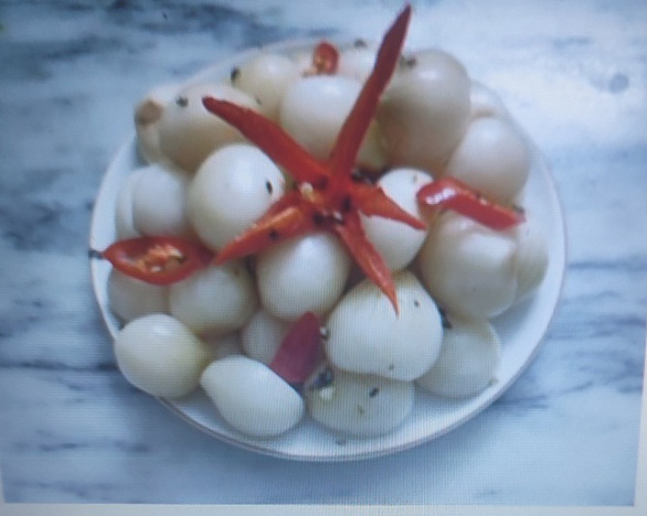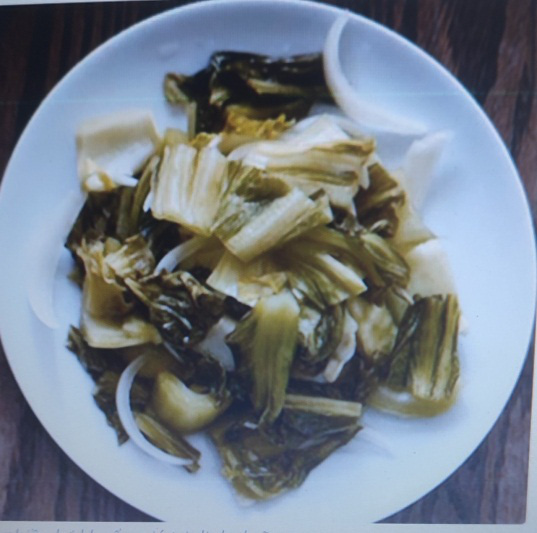 Dưa thì thường dùng cải bẹ già, rửa sạch để cả lá phơi cho héo rồi cũng muối và nén như muối hành. Cũng có khi người ta còn muối chung, nén lên trên hành. Khi sắp ăn, dưa được vớt ra vắt cho ráo nước rồi xắt lát để chung với hành muối mà quê tôi gọi là hành chắm, thêm vài lát gừng xắt mỏng bày vào trong đĩa.