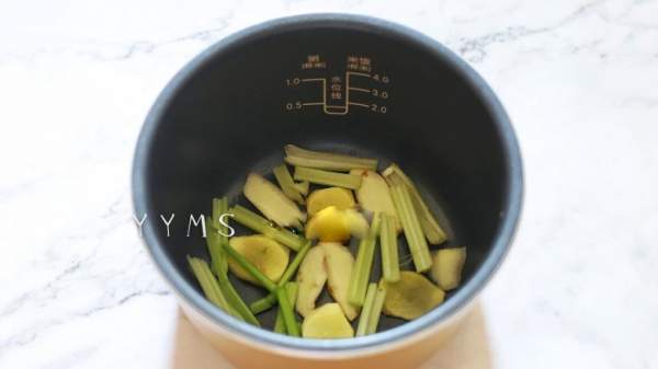Gừng rửa sạch thái lát. Cần tây rửa sạch cắt khúc sau đó xếp gừng và cần tây xuống đáy nồi cơm điện. Những nguyên liệu này có thể đệm gà và ngăn gà tiếp xúc trực tiếp với đáy nồi, khiến gà không bị cháy hoặc chín quá khi tiếp xúc với đáy nồi.