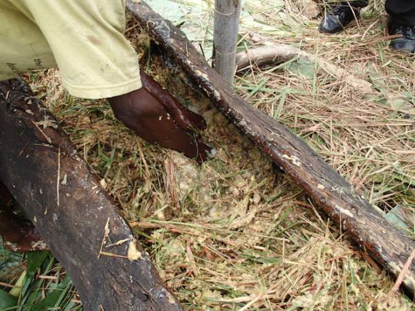 Cuối cùng, họ đặt cả thân cây gỗ xuống một cái hố đào sẵn và phủ rơm lên để nó lên men. Khi hỗn hợp đã lên men vừa đủ, người ta sẽ lọc lấy nước.