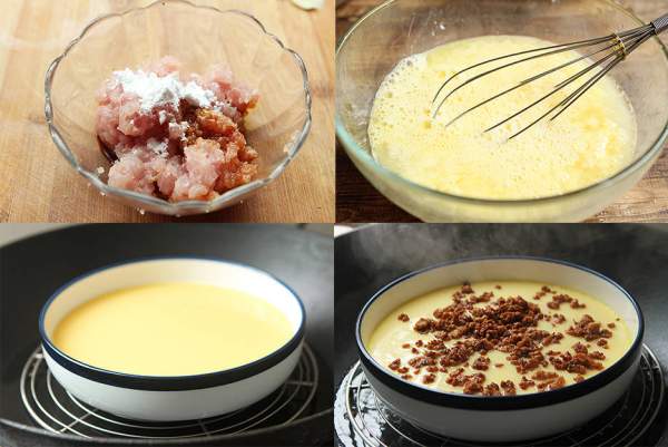 Trứng gà đánh tan cùng chút muối, thêm lượng nước ấm gấp 1,5 lần lượng trứng. Đánh lại lần nữa, hớt bọt và có thể lọc qua rây để hỗn hợp sữa nước thêm mịn. Hấp trứng khoảng 15 phút.
